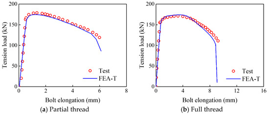 Figure 15 shows the comparison of tension load–elongation curves between FE and test results. For both partial- and full-thread bolts, it shows the material properties calibration inputted into the FE model can accurately describe their tensile behaviors, and the maximum deviations of the ultimate tension resistance and the fracture deformation are 2.2% and 6.7%, respectively. Test set-up and measurement of high-strength under tensile–shear load and pure shear force are not represented in the literature, and thus the load–deformation responses are not comparable with FE simulation. Nevertheless, the ultimate resistances as one of the most important factors controlled in the relevant standards or code, are used to discuss the applicable range of tensile and shear constitutive models. Additionally, high-strength bolts reach their ultimate shear capacity as its fracture deformation, as shown in Figure 12, so the accurate ultimate shear resistance prediction can also reflect the reasonable ductile fracture models employment.