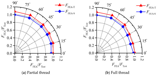 Figure 16 shows the Taylor distribution of the ultimate resistance ratio between FE and the experimental results, where the angle referring to the tension-to-shear angle θ shown in Figure 13 is from the literature [30]. It is found that both types of high-strength bolt show a similar ultimate reaction under tension–shear coupling loads. For a tension-to-shear angle θ under 30°, defined as a tension-dominated state, the tensile true stress–strain relation may overestimate the ultimate capacity of high-strength bolts with a partial thread below 3% with an average deviation of less than 1.0%, compared to the underestimation of over 8% by the shear constitutive model. Hence, the tensile true stress–strain relation with BW models can accurately predict the tensile-dominant behaviors of high-strength bolts.