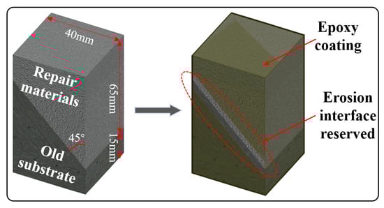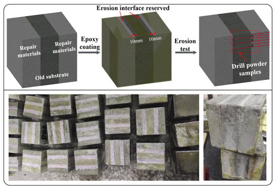 The repair mortar specimens were prepared following the mix proportions shown in Table 4. After pouring, the specimen was covered using plastic film and regularly watered for curing. The specimen was demolded after 2 d and moved into the standard curing room to continue maintenance. The specimen used for measuring the chloride ion is displayed in Figure 1. The specimen size was 70.7 mm × 70.7 mm × 70.7 mm, with repair materials on both sides and repair substrates in the middle. After 28 d of curing, the specimen surface was coated with epoxy resin, and the erosion surface was reserved. When the specimen was eroded to the specified age, powder samples were drilled along the bonding interface according to the direction of erosion depth, and the chloride amount at various penetration depths was determined. The preparation process of the specimen used to test the deterioration of bond performance is shown in Figure 2. The change in the bond strength under the erosion environment was tested by using the 45° shear bond specimen. The size of the specimen was 40 mm × 40 mm × 80 mm. The surface of the bonded specimen was wrapped with epoxy resin, and only 10 mm range at the bonding interface was reserved as the erosion surface.