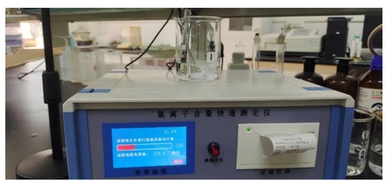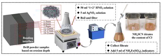 When the mortar specimens were eroded to the corresponding age, the powder samples were drilled along the direction of erosion depth. After drying, the samples were ground and sieved to pass through a 75 μm sieve. Free chloride ion content (Cf) was determined using potentiometry using a chloride ion selective electrode. A total of 1 g of sample was immersed in 40 mL deionized water for 24 h, and then the chloride ion concentration in the soaking solution was detected through a rapid chloride ion content meter, as illustrated in Figure 3. The free chloride ion amount in the powder sample can be obtained by conversion. The total chloride ion content (Ct) was measured following the acid solubilization approach. A total of 1 g of powder sample was taken and titrated with NH4SCN solution, and the total chloride ion amount was obtained following the test procedure in Figure 4.