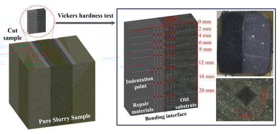 The block samples were taken 0~25 mm from the erosion surface. After drying, the samples were polished to 10,000 mesh by metallographic sandpaper and further polished with 12,000 mesh and 15,000 mesh polishing pastes. The microhardness was indented using a Vickers indenter from Shanghai Taiming Optical Instrument Co., Ltd. (Shanghai, China). A 40× objective lens was selected, and the eyepiece was used with an electronic microscope camera with a 10× magnification. The total magnification was 400×. The test force was 9.807 N (1000 gf), and the retention time was 15 s. Due to the difference in physical properties between the repair material and the mortar substrates, the deterioration may develop horizontally on both sides of the bonding interface in addition to the longitudinal development. Therefore, the longitudinal indentation points were selected at 2 mm, 4 mm, 6 mm, 8 mm, 12 mm, 16 mm, and 20 mm along the direction of erosion depth, and the transverse indentation points were selected at 1 mm, 2 mm and 3 mm from the bonding interface, as shown in Figure 5. Indentation should try to avoid the holes in the materials. Vickers hardness value was calculated according to Equation (3).