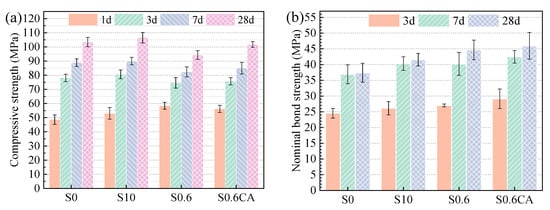 The compressive strength and bond strength of the repair mortar are illustrated in Figure 6a,b. In Figure 6a, the compressive strength of S10 at all ages was higher than that of S0. After adding a suitable amount of SAC, ettringite (AFt) and hydrated calcium silicate (C-S-H) gel were interspersed and filled with each other, which was conducive to optimizing the pore structure and improving the density of the system. Furthermore, the dissolution and hydration reaction process of OPC was promoted by the rapid hydration release of SAC and the consumption of hydration products such as Ca(OH)2. After adding PVA fiber, the compressive strength of S0.6 was higher than that of S10 at 1 d, but lower than that of S10 at all other curing ages. The reason is that the pastes containing fibers tended to become entangled and agglomerate during the mixing process, trapping air in the mixture. The bubbles formed through the mixing procedure were also impeded by the fibers, making it difficult for bubbles to escape from the surface of the specimen []. This leads to higher porosity of the mortar. The compressive strength of S0.6CA was higher than that of S0.6 at all ages. It is explained that after adding CAs, the complex precipitation products had a certain filling effect on the pores brought about by PVA fibers, which promoted the repair mortar to be more compact, thereby weakening the adverse effect of PVA fiber on the compressive strength.