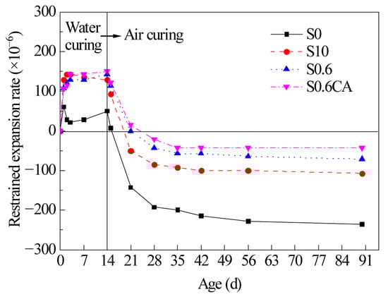 The restrained expansion rate of repair mortar is illustrated in Figure 7. During curing in the water, due to the micro-expansion characteristics of SAC, the S10, S0.6, and S0.6CA exhibited higher expansion deformation compared to the S0. Among them, the addition of PVA fibers inhibited the expansion of mortars in water, which is caused by the constraint effect of fibers on the deformation of repair mortar. The addition of CAs can promote the expansion of the mortar. This is because under the condition of sufficient water, new healing products were continuously produced by the reaction of the active substances in CAs and filled in the pores and microcracks. In this process, a certain extrusion action occurred on the hole wall and crack, causing the expansion and deformation of the specimen volume.