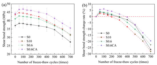 The impact of seawater-freeze-thaw coupling on bond strength is shown in Figure 8a,b. Compared with the repair material itself, there were more pores and microcracks in the bonding interface area, so it is more prone to deterioration in a harsh environment. In the salt freezing test, seawater penetrated along the bonding interface, and the pores in the interface area were in a water-filled state. During the freezing process, the expansion stress was generated, so that the repair material was gradually separated from the substrate. From Figure 8a, it can be found that after 50 freeze-thaw cycles, the shear bond strength of each test group began to decrease. After 700 freeze-thaw cycles, the residual bond strength of S0.6CA was highest. This is due to the continuous self-healing effect of CAs on microcracks and pores at the interface during freezing and thawing cycles. Furthermore, the compactness of the bonded interface region between the repair mortar added with CAs and the substrate was higher, and the resistance to seawater penetration was better. Thus, the degree of water saturation in the interfacial pores was relatively lower.