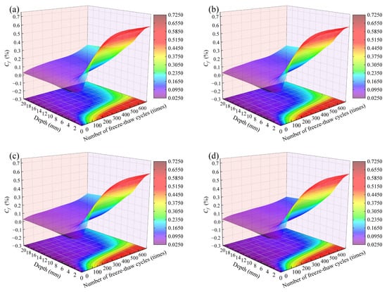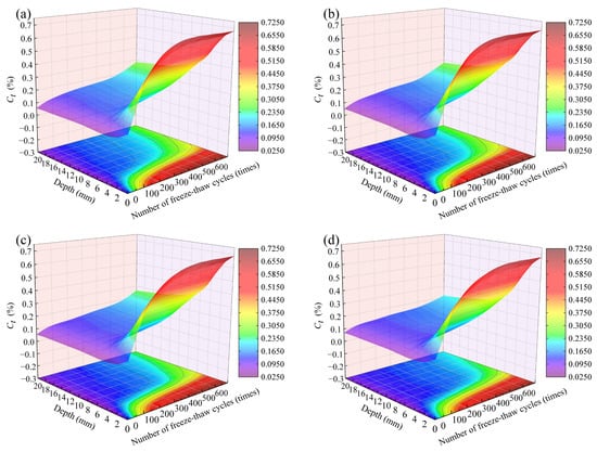For the dispersion of total chloride ion (Figure 10a–d), after 50 freeze-thaw cycles, the Ct at the bond interface started to increase in the depth range of 0~20 mm. The deterioration of the bond interface responded to the freeze-thaw action to a high degree, because there were more connected pores on the bonding interface, which were less resistant to freeze-thaw. As soon as freezing and thawing began, chloride ions in seawater were transported deeper along the interface. Meanwhile, because of the relatively weak adhesive forces at the interface, the expansion stress generated by freezing caused the cracks at the interface to continuously expand and extend inward, accelerating the permeation process of chloride in the interface. When the number of freeze-thaw cycles was low, the cracks did not extend deeper into the interface, and the amount of chloride ions penetrating was relatively small. Moreover, the monosulfate hydrated sulfoaluminate (AFm) in the repair material reacted with free chloride ions to form Friedel′s salt, thereby reducing the concentration of free chloride ions and also sealing a portion of the permeation channel [].