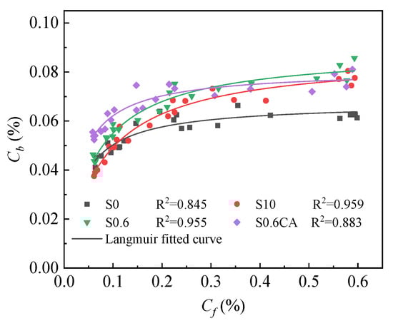 Figure 11 presents the relationship between the free chloride ion and total chloride ion amounts at the bonding interface. The measured results were fitted with the Langmuir adsorption equation [], the adsorption equation is shown in Equation (4), and the relevant fitting parameters are listed in Table 6. When Cf > 0.30%, Cb basically no longer increased, indicating that in this concentration range, the fixation of chloride ion at the interface by hydration products was close to saturation. The reason for this is that there is a large difference in chloride binding capacity between the repair material and the substrate on both sides of the bonding interface. The chloride binding capacity of the modified repair material was higher than that of the normal substrate. When chloride ions entered the interface, more free chloride ions were combined with the repair material. The chloride binding capacity of S0.6CA was highest when Cf < 0.30%. This is because the CAs promoted the generation of more hydration products at the interface, such as C-S-H gel and Mg(OH)2 gel, which may encapsulate chloride ions. When Cf was higher, the chloride binding ability of different test groups at the bonding interface corresponded to that of the repair material itself. The binding abilities of S10, S0.6, and S0.6CA were similar, followed by S0.