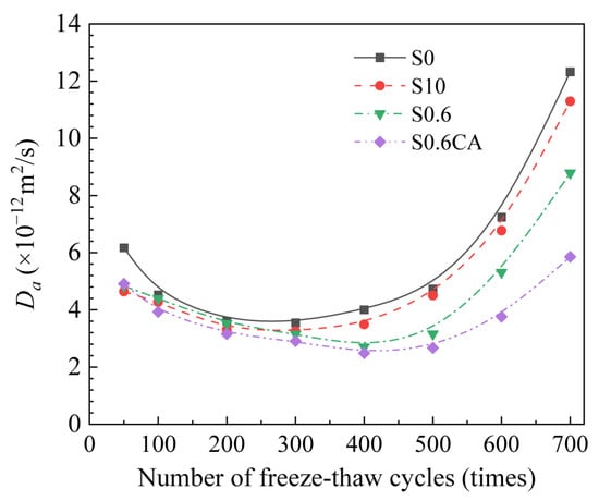 On the basis of the macro diffusion model of chloride ion in Equations (5) and (6) [,], the chloride diffusion coefficients at the bonding interface under seawater-freeze-thaw action were calculated by substituting the Cf measured at the bonding interface into the formula. The results are illustrated in Figure 12. The permeating speed of chloride ions at the bonding interface was much higher than that in the repair material, which is because the bonding interface was more susceptible to the expansion of ice and salt induced by the seawater-freeze-thaw environment. Once cracks occurred at the interface, chloride ions quickly penetrated along the interface to the surface of the reinforcement, causing corrosion of the steel bar. Therefore, in order to improve the resistance of the repair material to chloride penetration, the strengthening of the bonding interface cannot be neglected. After 700 freezing and thawing cycles, the chloride diffusion coefficients of S0.6CA were reduced by 52.5% and 48.2% compared to those of S0 and S10, respectively. It can be demonstrated that the continuous repair and closure of damage and diffusion channels at the interface by CAs greatly retarded the chloride ion transport rate in the bonded interface. In the early stage of the freezing test, the chloride diffusion coefficient of S0.6 was not significantly different from that of S0 and S10. However, as the frequency of freezing-thawing cycles increased, the deterioration of the repair mortars closes to the interface of S0 and S10 also intensified, leading to a further increase in the number of chloride ion channels that can penetrate along the interface. After 700 freeze-thaw cycles, the chloride diffusion coefficient of S0.6 was lower, suggesting that fiber inhibited the cracking of the repair material and promoted the self-healing effect of CAs on interfacial damage, thus reducing the number of channels available for chloride penetration.