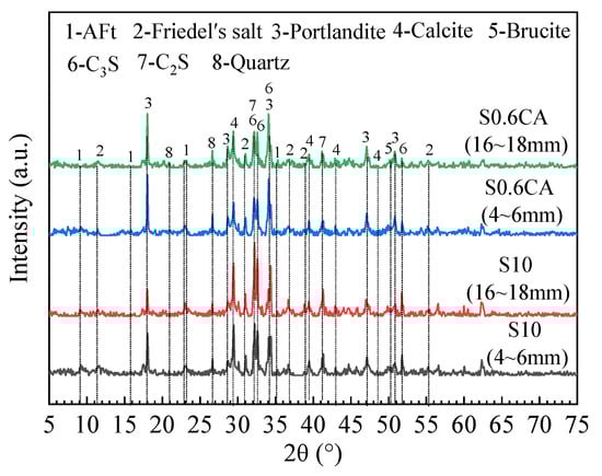 The powder samples obtained at the interface were actually a mixture of one side of the repair material and one side of the substrate. Figure 13 exhibits the XRD pattern at the bonding interface after 700 freeze-thaw cycles. During the hydration process of the bonded specimen, a water film was easily formed at the interface, and Ca(OH)2 was prone to be enriched and directionally distributed in the interface region []. Therefore, the diffraction peaks intensity of Portlandite in the sample at the interface was higher, which is also a reason for the lower bond strength of the interface area. In addition, the intensity of the diffraction peak of Friedel’s salt at the interface was also greater, which is attributed to the fact that a larger amount of Cl− penetrated along the interface and produced more Friedel’s salt. The intensity of the diffraction peaks of Friedel’s salt in the samples obtained at the depth of 4~6 mm was higher than that at the depth of 16~18 mm, suggesting that the number of Cl− penetration affected the quantity of Friedel’s salt. The diffraction peak intensity of Brucite in S0.6CA (4~6 mm) was lower than that in S10, indicating that the amount of Mg2+ in seawater permeated into S0.6CA was less. This reflects, to some extent, that S0.6CA had the superior resistance to erosive ion permeation at the bonding interface.