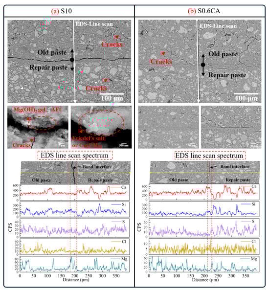 The BSEM-EDS image of the bonded interface after 700 freeze-thaw cycles is illustrated in Figure 14. In S10, the number of cracks on the side of the old substrate was more than that on the side of the repair material. This is due to the lower strength and compactness of the old substrate, which is more prone to cracking under the action of salt freezing. The development of cracks on the side of the old substrate in S0.6CA was essentially the same as that in S10, whereas the number of cracks on the side of the repair material was significantly reduced compared to S10. It is attributed to the cracking resistance effect of the fibers. From Figure 14a, it can be observed that a high amount of corrosion products was enriched in the cracks at the bond interface, mainly including AFt, Mg(OH)2 gel, and Friedel′s salt, which were produced by the reaction of seawater entering along the interface with cement hydration products. Both AFt and Friedel′s salts were strongly expansive, while the Mg(OH)2 gels were formed through displacing Ca2+ from Ca(OH)2 in the hydration products, which will lead to a looser microstructure of the cement stone. Therefore, the invasion of corrosive ions was also the main reason for the increase in microcracks in the bonding interface area.