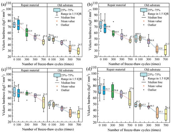 Effect of seawater-freeze-thaw environment on Vickers hardness of the repair materials: (a) S0; (b) S10; (c) S0.6; (d) S0.6CA.