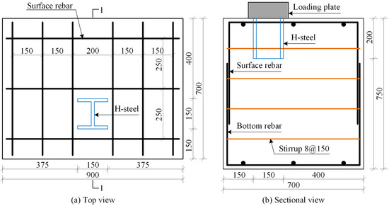 All specimens in this test group are provided with both surface and bottom rebars, and the rebar configuration is kept consistent across all specimens. The rebar configuration for the H-shaped steel shear lug specimen is shown in Figure 1. Specifically, the surface and bottom rebars are lapped at the midspan of the specimen, with a lap length of 300 mm; the stirrups adopt a double-leg configuration with a spacing of 150 mm. To facilitate load application, a steel plate measuring 200 mm × 200 mm × 80 mm is welded to the top of the H-shaped steel shear lug. In addition, the surface and bottom rebars are HRB400 steel with a diameter of 12 mm, while the stirrups are HPB300 steel with a diameter of 8 mm.