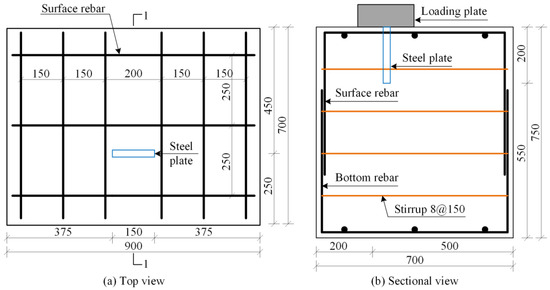 A total of eight steel plate shear lug specimens are designed in this test group. The primary variables include the height-to-thickness ratio of the steel plates (, which actually reflects the embedment depth of the steel plate) and the distance from the steel plate to the concrete edge (). All specimens have identical dimensions of 900 mm × 700 mm × 750 mm (length × width × thickness). The main parameters of the specimens are listed in Table 3. The specimen naming convention follows the format “S-Height-to-thickness ratio-Edge distance”. The steel plate shear lugs have a length of 150 mm and a thickness of 25 mm. Additionally, the strength grade of the steel is Q345, and its measured yield strength and ultimate tensile strength are 380.63 MPa and 576.49 MPa, respectively. The measured cube compressive strengths of the concrete used for each specimen are presented in Table 3.