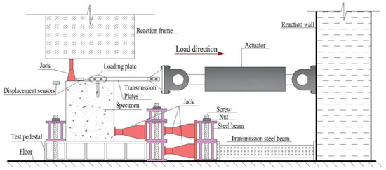 Figure 4 shows the schematic diagram of the test loading setup. The base of the testing machine (actuator) is fixed to the reaction wall, while its top is connected to a load transfer device. The load transfer device is connected to the loading plate on top of the specimen through two steel plates and four bolts, ensuring effective load transmission. To facilitate loading, the test is conducted by applying the tensile load in the horizontal direction. In practical engineering, the base of nuclear equipment foundations is fully anchored to the structural slab, with displacements in all three directions at the bottom completely restrained. To restrict the horizontal displacement of the specimen, two hydraulic jacks are placed on the side near the testing machine, and a steel beam is arranged on the opposite side to provide lateral restraint. In addition, to prevent the rotation of the specimen during loading, two hydraulic jacks are symmetrically arranged on the top surface of the specimen to provide vertical constraint. Through the above loading setup, the actual boundary condition of the equipment foundation can be well reflected, and the eccentricity of the specimen can be effectively avoided during the loading process.