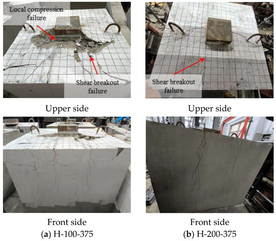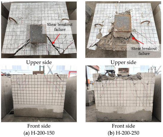 This test group consists of three types of specimens with = 150 mm, 250 mm, and 375 mm. For the specimens with small concrete edge distances ( = 150 mm and = 250 mm), the failure process and failure modes are similar. Taking specimen H-200-150 as an example, the failure process is summarized as follows: In the early loading stage, the specimen remains elastic without significant phenomena observed. When the load reaches approximately 230 kN, concrete splitting cracks appear along the longitudinal axis of the specimen, and the concrete begins to separate from the rear flange of the H-shaped steel. As the load increases further, shear diagonal cracks gradually appear in front of the H-shaped steel. When the load reaches 275 kN, the concrete in front of the H-shaped steel is crushed, and the shear diagonal crack widens significantly and extends to the side of the specimen. Thereafter, the displacement grows rapidly, and the specimen loses its bearing capacity.