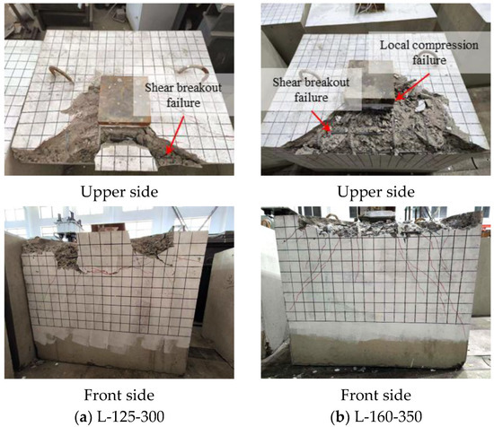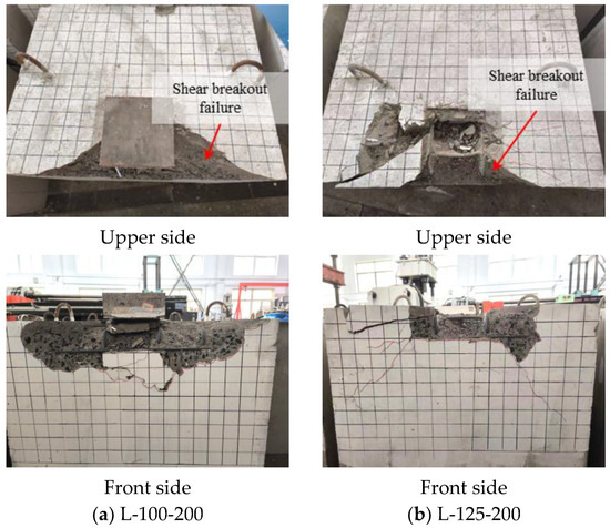 For specimens with large concrete edge distances ( = 300 mm and = 350 mm), the failure mode exhibits characteristics of both concrete local compression failure and concrete shear breakout failure, with the latter ultimately dominating the failure process. Compared to specimens with small concrete edge distances, the shear cone in these specimens is more extensive. Additionally, for specimens with three different leg lengths, the front side of the concrete displays significant cone-shaped spalling. Figure 8 presents the typical failure modes of angle steel shear lug specimens with large concrete edge distances.