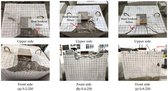 For specimens with small concrete edge distances ( = 250 mm), the failure mode is characterized by concrete shear breakout failure. Cone-shaped spalling is observed on the concrete surface in front of the steel plate, where diagonal cracks initiate and propagate toward the concrete edge, eventually reaching the front side of the specimen. For the specimen with a height-to-thickness ratio of = 2, only two major diagonal cracks appear on its surface, and these cracks do not extend to the bottom of the specimen. In the case of the specimen with = 4, in addition to the major cracks, several parallel cracks also develop. In specimens with = 6 and = 8, the diagonal cracks on their surfaces are more numerous and denser than those of specimens with = 4, and some of them even extend to the diagonal rear of the loading plate. These cracks show a tendency to extend towards the bottom of the specimen, and the larger is, the greater the depth of extension. Moreover, these specimens form a distinctly conical concrete block on their front side, but no spalling occurs. The typical failure mode of steel plate shear lug specimens with small concrete edge distances is shown in Figure 9.
