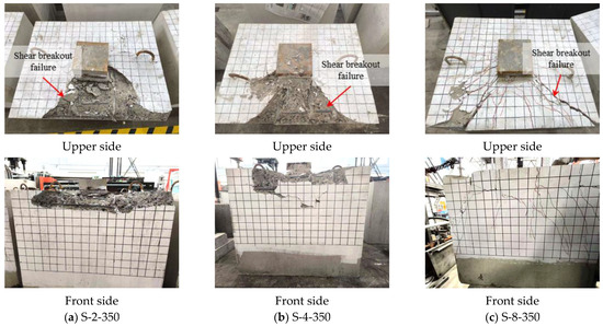 For specimens with large concrete edge distances, the S-2-350 specimen (characterized by small embedment depth) exhibits concrete local compression failure. In contrast, the remaining specimens primarily experience concrete shear breakout failure. Additionally, the crack development and failure modes with different are consistent with those observed in specimens with small concrete edge distances. Figure 10 illustrates the typical failure modes of steel plate shear lug specimens with large concrete edge distances.