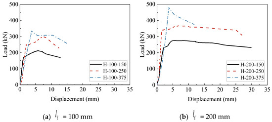 Table 4 summarizes the test results of H-shaped steel shear lug specimens, and Figure 11 presents the corresponding load–displacement curves. For specimens with an embedment depth of = 100 mm, brittle failure is observed regardless of the edge distance. For specimens with = 200 mm, those with edge distances of = 150 mm and = 250 mm exhibit a gradual reduction in shear capacity after reaching the peak load, which indicates that the specimens have a certain degree of ductility. However, when = 375 mm, the failure of the specimens involves the local crushing of concrete. Therefore, the specimens experience a rapid loss of stiffness and shear capacity following the peak load, which shows obvious brittle failure characteristics.