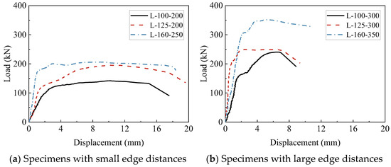 Table 7 summarizes the test results of angle steel shear lug specimens, and Figure 12 presents the corresponding load–displacement curves. The results show that all the specimens except specimens L-100-300 display an extended plastic deformation phase throughout the loading process. After reaching peak load, these specimens show a gradual decrease in shear capacity with increasing displacement, reflecting favorable ductility. In contrast, the specimen L-100-300 exhibits a rapid decrease in stiffness and shear capacity after reaching the peak load, which exhibits pronounced brittleness.