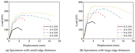 Table 9 shows a comparison of the shear performance of angle steel shear lug specimens with different concrete edge distances. As shown in Table 9, with the increase in the concrete edge distance, the shear capacity of the specimens improves, whereas their deformability significantly decreases. Compared to the specimens with = 200 mm, the specimens with = 300 mm show an increase in shear capacity of about 28% to 71% and a reduction in peak displacement of about 35% to 72%. Furthermore, the test phenomenon indicates that the concrete edge distance has a certain effect on the failure mode of the specimens. At the small concrete edge distance, the failure mode of the specimens is characterized by concrete shear breakout failure. As the concrete edge distance increases, the failure mode of the specimens shows the composite characteristics of concrete local compression failure and concrete shear breakout failure.