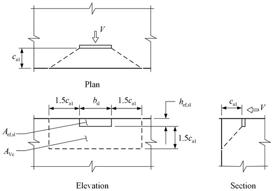 In Equation (4), the term can be viewed as the projected area of the concrete breakout surface resulting from the loaded anchor, as shown in Figure 15a. By replacing in Equation (4) with (which represents the projected area of the concrete breakout surface resulting from the loaded shear lug, as shown in Figure 15b), the equation for evaluating the basic concrete shear breakout capacity of the shear lug can be obtained as follows: