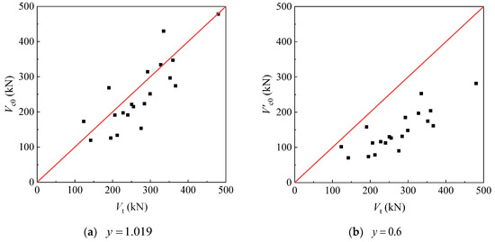 It should be noted that the value of in Equation (6) is determined based on the best fit between the calculated results and the test data but cannot be applied in the design because it only offers approximately 50% probability confidence in the safety side. If the same value of y is taken as the coefficient in Equation (3), i.e., , an equation similar to the expression for the concrete shear breakout capacity of the anchor can be obtained as follows: