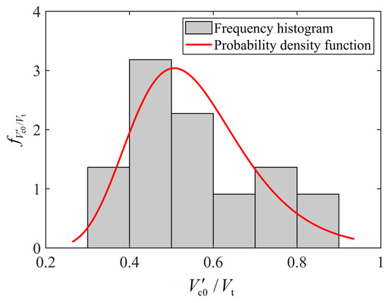 The shear breakout capacities calculated using Equation (7) (i.e., ) are compared with the test results obtained in this paper, and the results are also shown in Table 14 and Figure 17. It is evident that all calculated capacities are lower than the corresponding test values, and the statistical analysis of in Table 14 is shown in Figure 18. Meanwhile, the goodness-of-fit testing indicates that does not reject the assumption of a lognormal distribution, and the mean and standard deviation of the logarithm of are and , respectively. It should be noted that Equation (7) can be treated as an expansion of Equation (3), which was originally used for a single anchor, because it becomes identical with Equation (3) in the case of and .