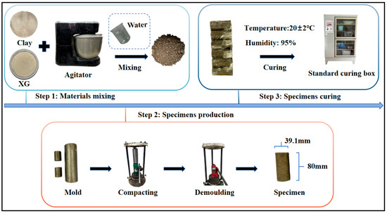 (1) Material preparation: To ensure the full utilization of XG and achieve its uniform mixing with clay particles, this study (based on existing research results [17]) adopts the dry mixing method as the main mixing process. According to the test plan, first weigh the corresponding mass of XG dry powder and clay, then use a mixer to mix and stir the two for 5 min. Then, pour in the corresponding mass of water and continue stirring for 10 min to ensure the uniformity of the mixture among various materials.
