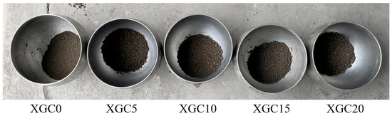 To ensure the comparability between different samples, the density of the samples was controlled at 1.76 g/cm3, the degree of compaction was 95.1%, and five parallel samples were prepared for each group of samples. According to the GB/T 50123-2019 standard [36], sample preparation was performed via the pressure sample method. The sample preparation process is shown in Figure 2, and the morphology of the mixture under different XG dosages is shown in Figure 3. The sample preparation steps are as follows: