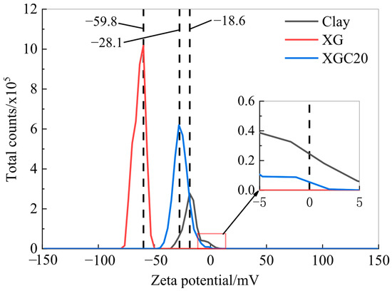 Zeta potential analysis is an important characterization method for studying the interface interaction between pore fluids and soil particles. By measuring the potential changes in the double electric layer shear surface on the particle surface, it can effectively evaluate the electrostatic interaction between particles [37]. Figure 4 shows the Zeta potential plot of clay, XG, and XGC20; as shown, the Zeta potential values of clay, XG, and XGC20 are −18.6 mV, −59.8 mV, and −28.1 mV, respectively. The above results indicate that clay, XG, and XGC20 all carry negative charges. Among them, XG has a strong negative charge, the negative potential value of clay is relatively low, and XGC20 is between the two. This might be partly because when XG is combined with clay, part of the negative charge of XG is electrostatically neutralized by the cations in the clay, forming strong ionic bonds and hydrogen bonds, which is conducive to the aggregation of clay particles [38,39]. On the other hand, this might be attributed to the encapsulation effect of the anionic groups of XG on clay particles [40]. However, notably, due to the strong poly-anion properties of XG, the composite material still maintains a stable net negative charge [41].