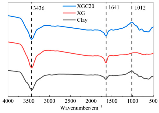 To reveal the interface interaction mechanism of composite materials, infrared spectroscopy tests were conducted in this study. Figure 5 shows the infrared spectra of clay, XG, and XGC20. Combined with the infrared spectra, the -OH stretching vibration peak appears at 3436 cm−1 [42]. The -C=O stretching vibration peak appears at 1641 cm−1 [43], and the Si-O stretching vibration peak appears at 1012 cm−1 [44]. The infrared spectroscopy analysis indicated that XG is rich in hydroxyl and carboxyl groups, which promotes the intermolecular interaction between XG and clay. The specific manifestations are as follows: The hydroxyl stretching vibration peak at 3436 cm−1 has significantly broadened and is accompanied by a slight displacement in XGC20, which is attributed to the fact that the -OH groups in the XG molecule have formed a wide hydrogen bond network with the clay surface [45]. At 1641 cm−1, the characteristic peaks of the adsorbed water of the clay itself were significantly enhanced in XG and XGC20 and shifted towards a higher wavenumber, which confirmed that the negatively charged groups in the XG molecules had electrostatic interactions with the cations at the edge of the clay [46]. At 1012 cm−1, the characteristic peak of XG was significantly weakened after being combined with clay, which directly reflected the effective coating effect of XG molecules on clay particles [47].