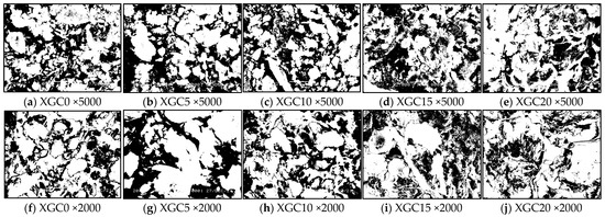 Black and white binary diagram of XGC sample at different magnifications: (a) XGC0 ×5000; (b) XGC5 ×5000; (c) XGC10 ×5000; (d) XGC15 ×5000; (e) XGC20 ×5000; (f) XGC0 ×2000; (g) XGC5 ×2000; (h) XGC10 ×2000; (i) XGC15 ×2000; (j) XGC20 ×2000.