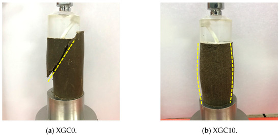 Figure 11 shows the typical failure morphology of the XGC sample. Figure 11a shows that the XGC0 sample formed a crack during failure. Figure 9 shows that the sample strength decreases rapidly due to the occurrence of cracks after the XGC0 sample reaches the peak value. Figure 11b shows that the XGC10 sample changed from shear failure to swelling failure. Figure 9 shows that the XGC10 curve was in a state of slow decay in strength after reaching the peak UCS. Curing clay using XG can improve its ductility and allow it to bear greater loads and retain a specific load-bearing capacity after reaching the ultimate load it can bear.