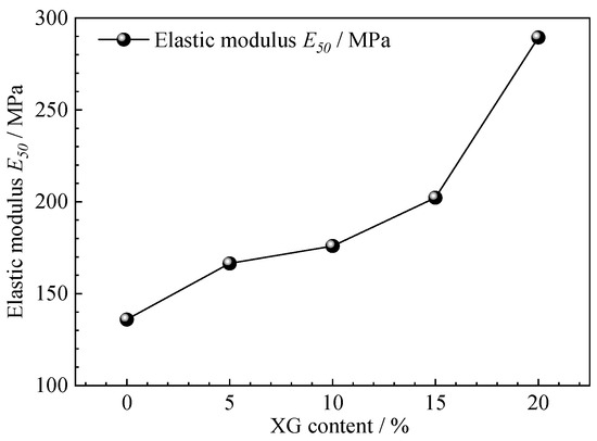 The elastic modulus E50 [48] was introduced to study the influence of XG on the elastic modulus of clay, and the elastic modulus of different XGC samples is summarized and compared. The calculation formula is shown in Formula (3), and the results are shown in Figure 12: