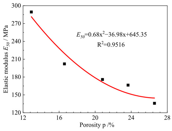 The fitting curve of porosity and elastic modulus E50 of the XGC sample.