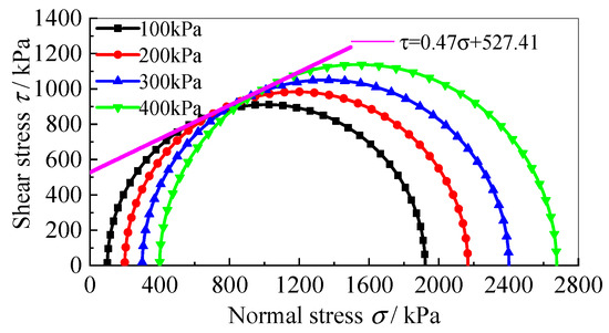 The Mohr–Coulomb theory was used to calculate the shear resistance index. The XGC10 sample was selected as a typical model to draw the Mohr–Coulomb circle, as shown in Figure 15, and its shear strength index cohesion c and internal friction angle φ were calculated.