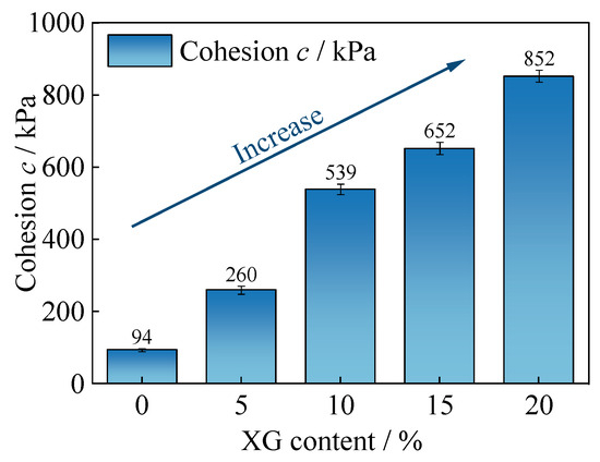 (3) The addition of XG can significantly enhance the UCS and cohesion of the specimen, but it has a relatively small impact on the internal friction angle. When the XG content was 20%, the UCS of the sample was 1482 kPa, and the cohesion was 852 kPa. Compared with the control group without XG addition, the increase was 296% and 806%, respectively. Under different XG dosages, the internal friction angle of the samples remained within the range of 25.7 ± 1.51°, showing no obvious changing trend compared with the control group.
