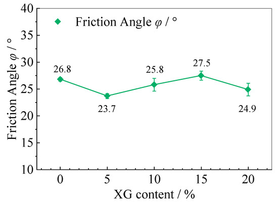 Figure 16 is a bar graph showing the relationship between XG content and cohesion. Figure 17 is a line graph showing the relationship between XG content and the friction angle. It can be found that the content of XG has a significant effect on the cohesion of the XGC samples but has little effect on the friction angle. The more XG added, the stronger the cohesion of the XGC samples.