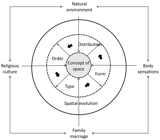 Starting from the unique cognitive position of the body, Polanyi further vividly describes auxiliary consciousness as “indwelling” or “internalization.” The mind indwells in the body, and in knowing external things, our body plays an instrumental role, and we only have auxiliary consciousness of our own body [28]. The Mosuo people have well integrated their bodies into their environment; their concepts are embodied through the configuration and material expression of space, and the organization and order of space further strengthen the impression of these concepts in people’s minds. In the Lugu Lake area, the unique natural environment, the influence of Qiang culture, and the integration of diverse cultures together shape the Mosuo people’s unique spatial conceptual system (Figure 2), forming a unique settlement space structure where humans and gods coexist.