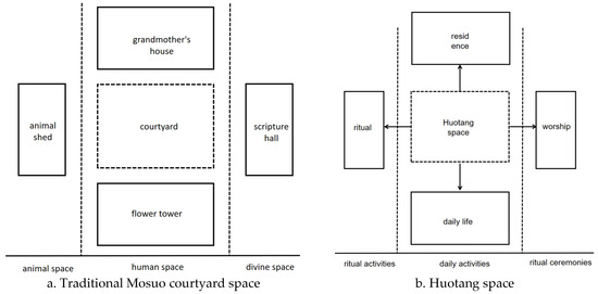 In summary, traditional Mosuo space is a manifestation of concepts under the comprehensive influence of its society, culture, and natural environment. The Mosuo people form close connections with specific places through physical activities such as dwelling, belief, and rituals. This cognitive and emotional connection is profoundly reflected from the settlement space to the living space. Understanding the generation and expression of Mosuo spatial concepts plays an important guiding role in understanding the Mosuo people’s unique “cohabitation of humans and gods” spatial composition.