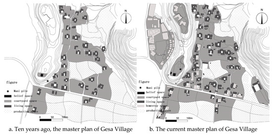 Gesha Village is located in Lugu Lake Town, Sichuan Province, and is a natural village under Mukua Village. In 2006, with the opportunity of the Winter Tourism Conference held in Liangshan Prefecture, Sichuan Province, the first government reception hotel in Sichuan Hucao Lake began to be built near the ancient village. As one of the most well-preserved ancient villages in the Hucao Lake area, Gesha Village was also developed as an auxiliary tourist facility for the hotel [34]. Taking Gesha Village as an example (Figure 5), by calibrating CAD data with the UTM Zone 47N projection system and converting it to a Shapefile to calculate the geometric area, between 2013 and 2023, the proportion of homesteads in Gesha Village increased from 33.75% to 52.71% (+18.96%), and cultivated land decreased from 29.96% to 21.64% (−8.32%); the building space expanded simultaneously, with Gesha Village adding a “guesthouse” category (accounting for 3.67% in 2023), and its building-related space (buildings + guesthouses) increasing from 2.20% to 7.41%; the area of religious space remained unchanged (193 m2), but due to the expansion of other spaces, its proportion stagnated, becoming a marginalized cultural symbol (Table 2). The spatial structure shifted from “homestead-cultivated land” binary dominance to a “homestead-building” composite type, reflecting a systemic shift in land use from agriculture to residential and economic functions.