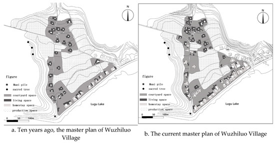Wuzhiluo Village is a natural village located in Boshu Administrative Village on the east bank of Lugu Lake, Sichuan Province. It is favored by tourism due to its location at the beginning of Caohai Lake. Tourism in Wuzhiluo Village began in the late 1990s. With the completion of the Caohai Lake road in 2006, the number of tourism households here has grown to more than 20. Villagers spontaneously formulated rules and models for collective participation in tourism, which largely protected the spatial structure of human–god cohabitation (Figure 8). Through quantitative analysis, the proportion of homesteads in Wuzhiluo Village increased from 43.60% to 56.94% (+13.34%), and cultivated land decreased from 48.90% to 36.91% (−11.99%). The proportion of “buildings” increased from 7.41% to 13.24% (+5.83%). The religious space, as seen in Gesha Village, showed no significant change (259 m2), also becoming a marginalized cultural symbol.