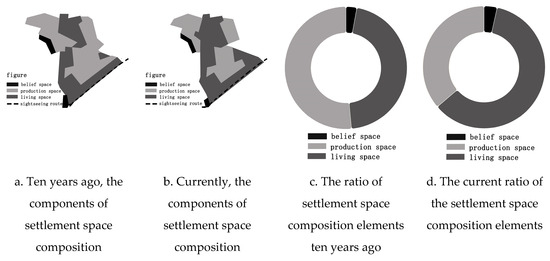 Today, to meet tourist demands, multifunctional and multi-type public spaces continue to emerge, but they still maintain their original spatial planning. The settlement is still composed of belief, living, and production spaces, and basically maintains its original proportional composition. Due to changes in production and lifestyle, the area of the belief space and the living space has increased, while the traditional production space has relatively decreased (Figure 9). Wuzhiluo Village did not show a separate guesthouse category, but its high building growth suggests the hidden penetration of tourism influence. A comparison between the two places shows that tourism development has accelerated the transformation of settlement space from a “belief-agriculture” equilibrium to a “residential-commercial” entity, and traditional spatial concepts have been reshaped under the dominance of economic rationality.