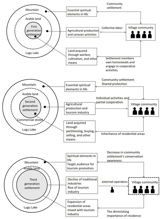 Among the seven surveyed villages, the number of villages with first-generation settlement space types is the smallest, and the number of villages with third-generation settlement space types is the largest. In addition, the spatial type of a village is related to its distance from Lugu Lake. Villages with first-generation settlement space types are farther from Lugu Lake, while villages with second and third-generation settlement space types are closer to Lugu Lake. Furthermore, first and second-generation settlements mostly appear in the Sichuan area of Lugu Lake, while the Yunnan area of Lugu Lake is entirely composed of third-generation settlements.