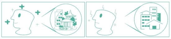 In recent years, mental health and well-being have become prominent discussion topics in architectural design. Architecture significantly impacts the psychological well-being of individuals []. Prior research indicates visible architectural components, such as shape, form, proportion, color, and materials, and invisible sensory factors, such as sound and scent, can profoundly affect human well-being [,]. Even though most architecture is intentionally designed by architects to positively impact building occupants [], specific architectural design characteristics may adversely affect the well-being of building users [,] (Figure 1).