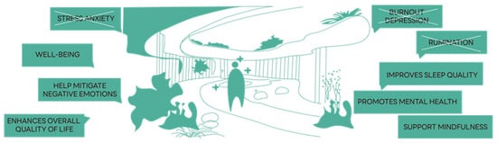 Amid growing efforts to address mental health issues, mindfulness has been receiving increasing attention []. It is being used by individuals and large organizations, and even incorporated into public policies in some countries [,,,]. Building upon this growing interest, an expanding body of research has highlighted the positive impact of mindfulness on mental health and overall well-being, including its association with better sleep quality and enhanced life satisfaction [,,,,]. Empirical studies further demonstrate that mindfulness practices can effectively alleviate a wide range of psychological challenges, such as stress, anxiety, emotional dysregulation, rumination, burnout, and symptoms of depression [,,,,,,,,,,,,]. In parallel, emerging evidence points to the potential of architectural environments to facilitate mindfulness, thereby offering additional pathways to support mental health and psychological resilience [] (Figure 2).