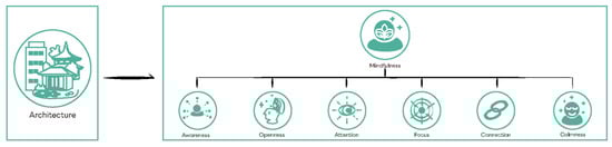 As the reviewed literature suggests, scholarly investigations into how architectural design can support or cultivate mindfulness remain relatively scarce. Moreover, the architectural concepts and specific design features that may stimulate mindfulness remain underexplored. Furthermore, existing research indicates that mindfulness is a complex psychological construct, closely associated with various interrelated mental states. It is conceptualized through six interlinked dimensions: awareness, openness, attention, focus, connection, and calmness [,,,,,,,,,,]. This finding leads to the formulation of this study’s research objective and question, which are outlined in the following section (Figure 3).