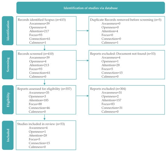 The reviewed articles explore architectural atmospheres that support different facets of mindfulness, including awareness (4 articles), openness (1 article), attention (28 articles), focus (5 articles), and connection (15 articles). Notably, no articles were identified that explicitly address architectural environments fostering calmness. The systematic literature review process conducted following PRISMA guidelines is illustrated in Figure 4.