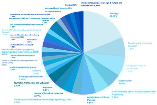 The publications published in Buildings accounted for nearly one-fifth of the papers, underscoring its role as the leading journal for research on architecture and mindfulness. Two additional journals, Frontiers of Architectural Research and Civil Engineering and Architecture, contribute about 8%. Sustainability, IOP Conference Series: Materials Science and Engineering, and Architecture and Urban Planning add roughly 6% apiece. The remaining half of the publications are spread across over twenty other journals and conference proceedings (Figure 6).