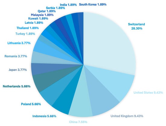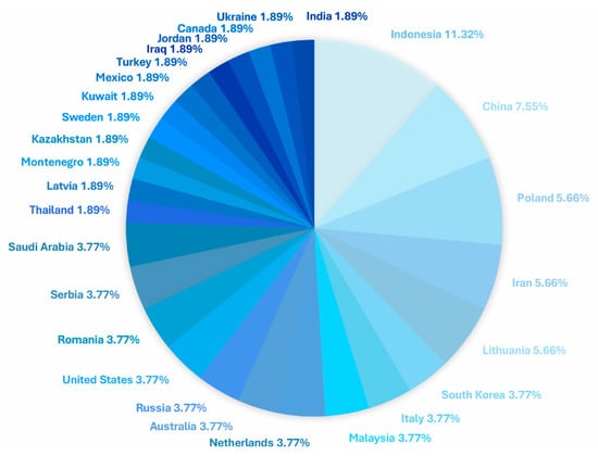 Indonesia provides the largest share of first authors, about 15%, with China close behind, at roughly 10%. Poland, Iran, and Lithuania each contribute 6–8%, while South Korea, the United States, Australia, the Netherlands, Italy, and Russia fall in the mid-single digits. All other countries, more than twenty, each supply less than 3% (Figure 8).